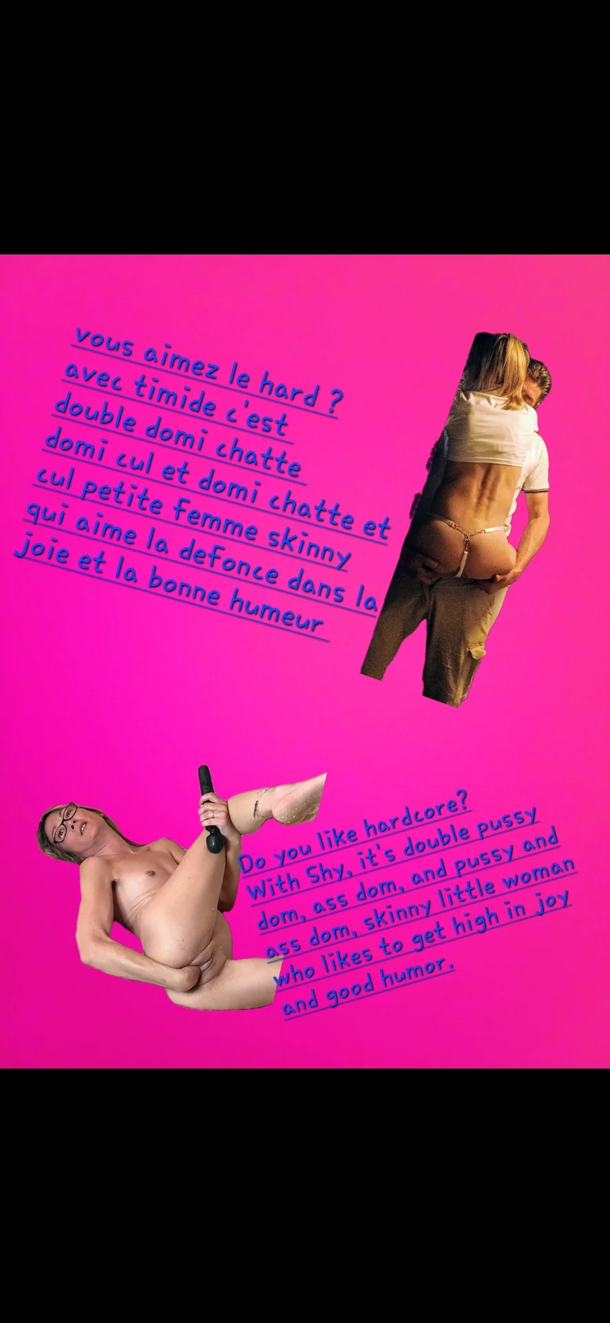 Ce que je fais : anal, vanginal,squirt,fist vaginalet anal ,double (penetration anal et vaginalou chatte) triple penetration chatte) double domi chatte ,domi chatte et cul,pommeau vitesse chatte et cul bate de baseball chatte ...sodomie en live baise ejac facial j'avale aussi mr me fist je prend partout